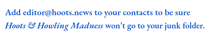 Sorry, Hoots & Howling Madness is on hiatus. Please check back later this summer, once we’ve had a chance to pull ourselves back together and get some work done. Thanks.